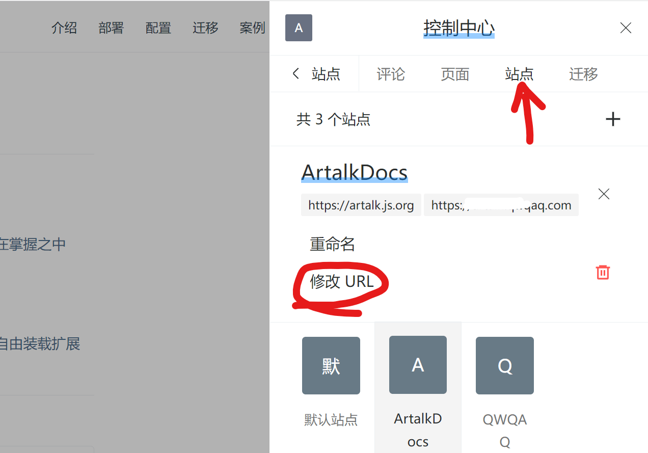 然后,你需要在侧边栏「控制中心」-「站点」找到 “举个栗子站点”,修改站点 URL。